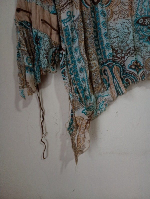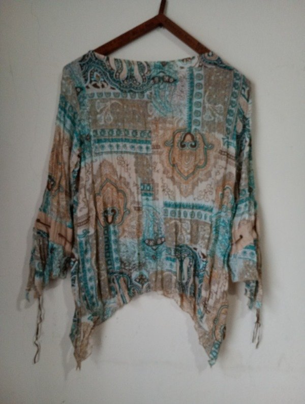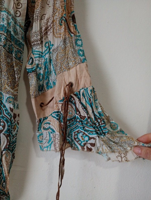 Esta es una blusa de estilo boho vintage, confeccionada en una tela ligera y translúcida con estampado étnico en tonos turquesa, beige y marrón. Tiene un diseño amplio y suelto, con mangas 3/4 y detalles deshilachados en los bordes que le dan un aire relajado y artesanal. El escote es en V con cordones cruzados de cuerda que aportan un toque rústico