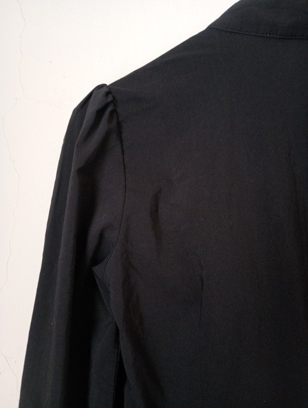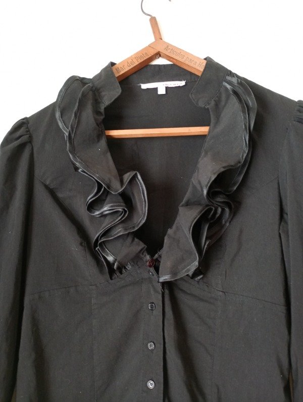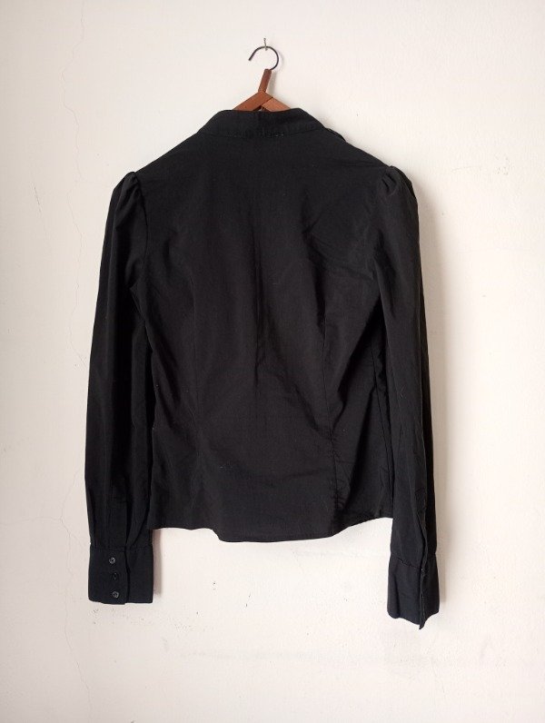 La prenda es una camisa negra de manga larga levemente elastizada con un estilo elegante y femenino. Tiene puños anchos que le dan un toque sofisticado y un detalle de volados en el escote, que caen hacia el frente con terminación satinada, aportando brillo y contraste al diseño. Se cierra en el frente con botones negros y presenta un corte ligeramente entallado que estiliza la silueta.